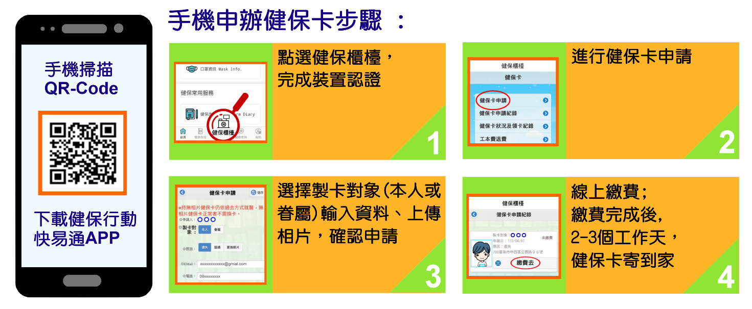 民眾可掃描下圖QR-code,並參考下列圖示四步驟申請健保卡;「健保櫃檯」尚有多項便民服務,相關作業如有不清楚或有疑問,可撥打健保署諮詢專線︰0800-030-598,手機請改撥02-4128-678洽詢。