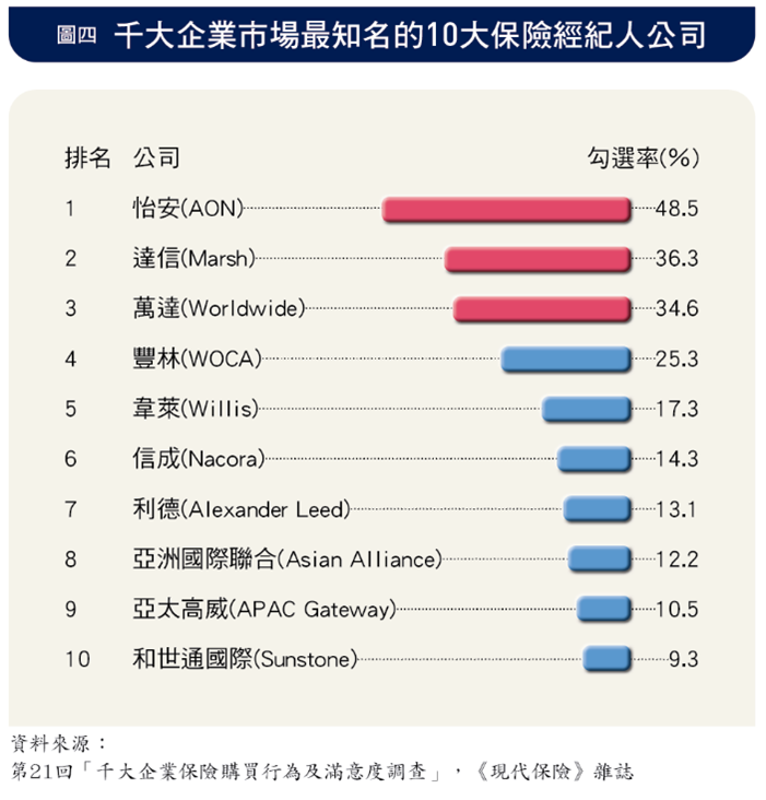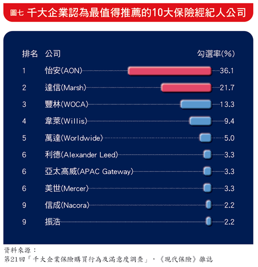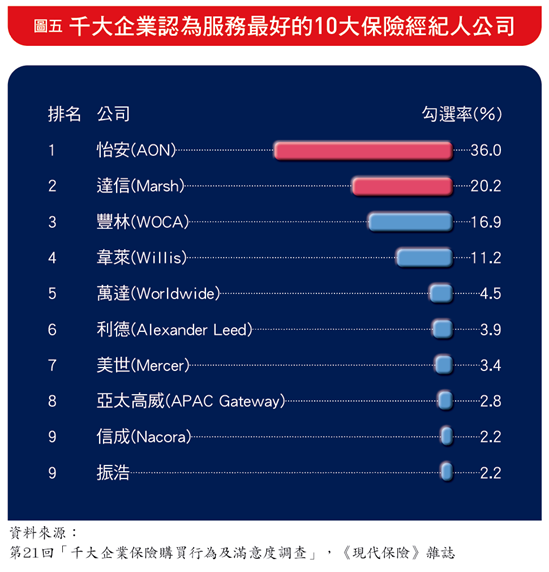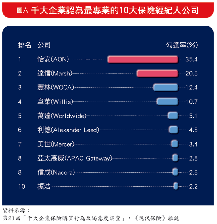 有了知名度,才有提供服務的機會,進而才能展現專業與服務的熱忱,並有機會獲得推薦,依本回調查,在專業、服務與推薦度三大指標上,勾選率最高的前五大公司的排序都一樣,分別為怡安、達信、豐林、韋萊與萬達。