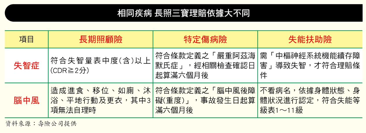 另外,像是失智症,長照險看的是「符合失智量表中度以上 」,特定傷病險則必須符合「條款定義之『嚴重阿茲海默氏症』,經相關檢查確認日起算滿六個月後」,而失能扶助險雖不看病名,但需「中樞神經系統機能續存障害」導致失智,才符合理賠條件。