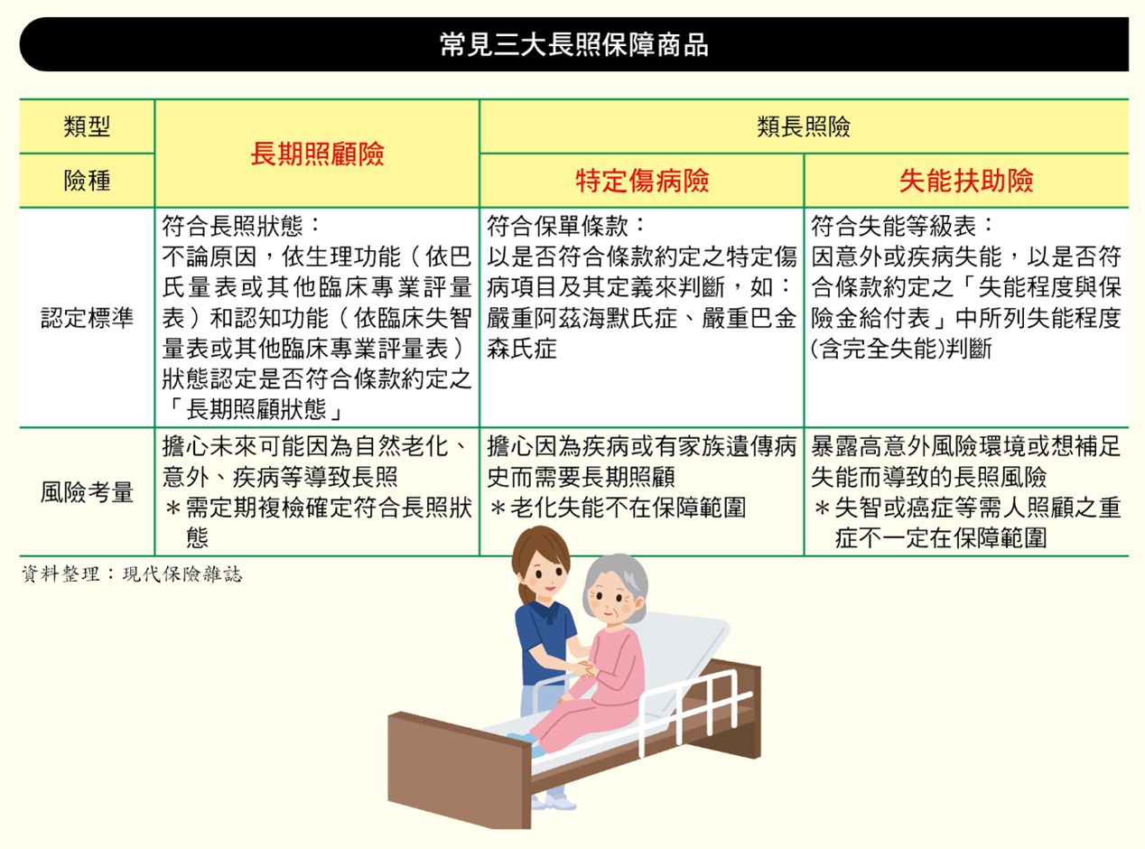 事實上,儘管長期照顧險、特定傷病險、失能扶助險,都可作為長期照顧的保障商品,但保障範圍不盡相同。長照險可以補足失能扶助險、特定傷病險未涵蓋的「自然老化導致生理功能障礙」,也能補強失能扶助險不能定期給付像是脊椎損傷的情形(脊柱運動障礙最高失能等級為第七級),此外,長照險以認知/生理功能障礙為認定標準,也適合補強特定傷病險(僅依病名理賠,不賠罹病後導致生活無法自理的風險)的理賠缺口。