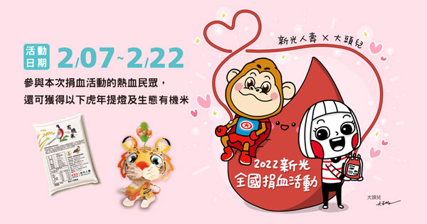 今年新光捐血活動特別與在各年齡層都廣受歡迎的LINE人氣暢銷貼圖「大頭兒」聯名合作,希望透過「大頭兒」身穿招牌紅白條紋,短髮妹妹頭瀏海的鄰家女孩親切形象,號召民眾愛心響應,踴躍熱血挽袖,一方便促進自身血液新陳代謝,也為即將到來的春節連假醫療用血預作準備。