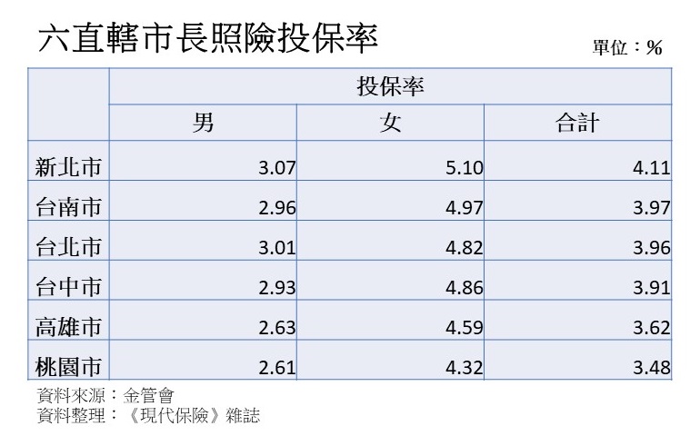 進一步看六都長照險投保率,投保率最高的是新北市,為4.11%,是唯一投保率超過4%的直轄市,至於六都最老的台北市,投保率僅3.96%,甚至比台南市還低。