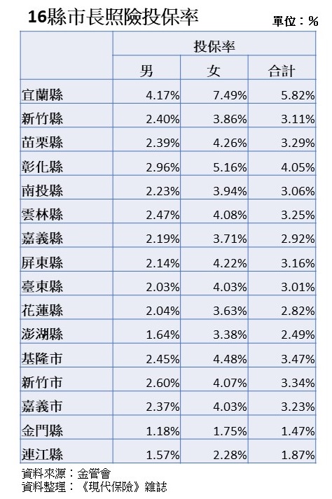 至於非直轄市,全台最老縣市是嘉義縣,65歲以上長者占比高達21.18%。但長照險投保率卻吊車尾,僅2.92%。