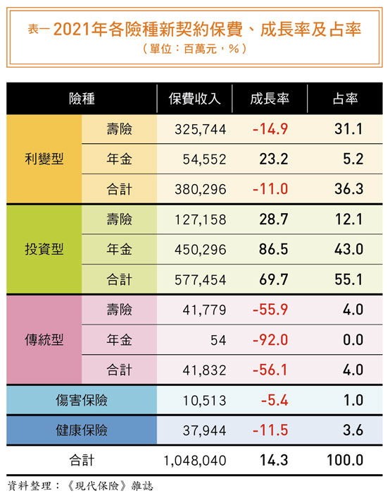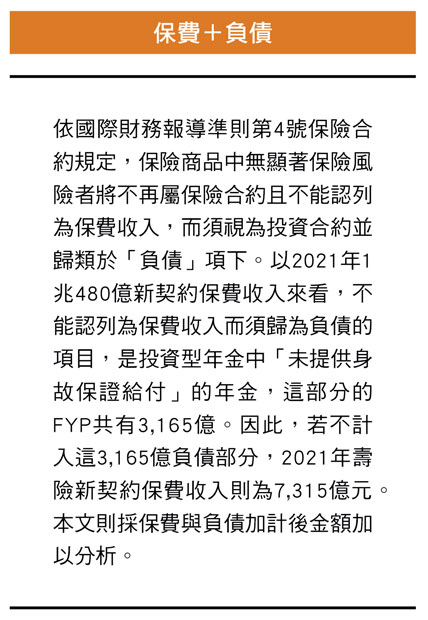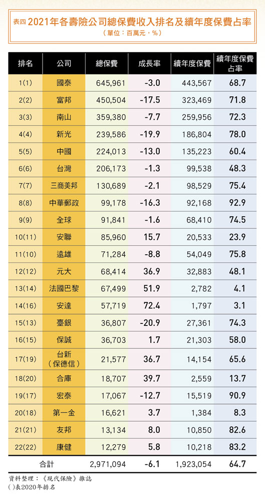 二○二一年新契約保費收入雖然成長十四.三%,但在續年度保費衰退一成四之下,連帶使得總保費負成長六.一%,為二兆九七一○億,未能保住三兆大關。續年度保費占總保費的比率,也從前年的七一%掉到去年的六四.七%。