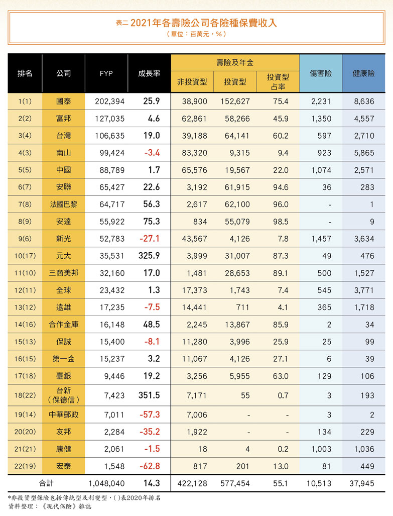 去年總保費整體排名變動不大,前十大公司,分別為國泰、富邦、南山、新光、中國、台灣、三商美邦、中華郵政、全球及安聯。其中,總保費位居第一的國泰,去年新契約保費雖成長二五.九%,但總保費卻衰退三%,而在二二家公司中,總保費正成長的公司除台新外,幾乎都是以投資型保單為銷售主力的公司。