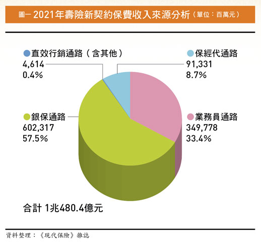 至於業務通路方面,由於銀行向來比較擅長銷售躉繳及投資型保單,去年在投資型商品熱銷下,連帶使得銀行通路保費占率提高,從前年的五二.三%增加到去年的五七.五%,而自家業務員FYP的占率則降為三三.四%,較前年下滑近五個百分點,但若以金額來看,去年業務員貢獻的FYP跟前年差不多,都是近三五○○億。保經代通路部分,去年新契約保費為九一三億元,比前年增加八四億,FYP占率跟前年差距不大,為八.七%,直效行銷與其他通路合計僅占○.四%。(詳圖一)