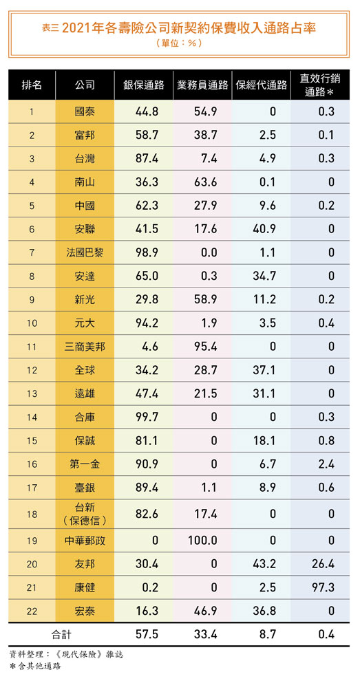 個別公司方面,較仰賴銀行通路且占率超過五成的公司,包括富邦、台灣、中國、法巴、安達、元大、合庫、保誠、第一金、臺銀及台新(保德信)。而以自家業務部隊為主力的公司,除了依法規定只能有業務員通路的中華郵政外,國泰、南山、新光及三商美邦四家來自業務通路的FYP都超過五成,其中,三商美邦業務通路占率更高達九五.四%。