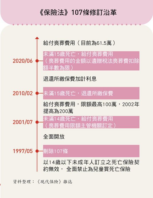 前一段時間,關於孩子的保險,各報章媒體不斷報導六一.五萬,為什麼會出現這樣的數字?這數字背後代表的意思為何?「這要從《保險法》一○七條的修訂講起,」蔡火炎說,《保險法》一○七條在二○二○年六月十日公布修正,修正的部分有兩項,第一項是規定以未滿十五歲的未成年人為被保險人所訂立的人壽保險契約,除了喪葬費用的給付外,其餘的死亡給付要在被保險人滿十五歲時才發生效力;第二項又規定,喪葬費用保險金是以遺產及贈與稅法第十七條有關喪葬費用扣除額的一半為限,而目前財政部公告的喪葬費用扣除額是一二三萬元,一半就是六一.五萬元。