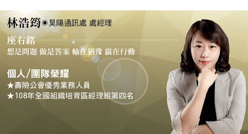 業務工作挑戰性高,一直以來被認為需要積極主動、建立人際關係、敏銳洞察等能力,但也讓部分想嘗試的人望而卻步。中國人壽昊陽通訊處處經理林浩筠分享,當初加入保險業的契機,就是看中保險業能有效提升業務技能,對她而言工作的發展性很重要,再加上對客戶的承諾,讓她一路堅持在保險業奮鬥,至今剛好滿20年。