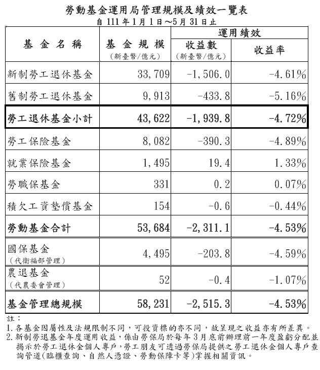 勞動基金今(7/1)日公布整體基金截至111年5月底止規模為5兆3,684億元,今年全球持續受到疫情、俄烏戰爭影響及高通貨膨脹等因素衝擊,股票及債券市場均大幅下跌,勞動基金積極管控投資風險,截至5月底投資收益-2,311.1億元,未年化收益率-4.53%。