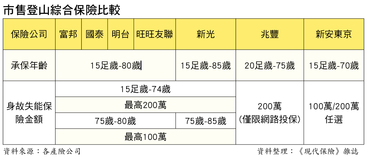 據了解,目前有販售登山綜合保險的業者有富邦、國泰、新光、明台、兆豐、新安東京和旺旺友聯7家公司。在投保年齡上限的部分,依各家保險公司判斷能承擔的風險程度能力而有所不同,其中新光產物可接受承保年齡上限為85歲。而富邦、國泰、明台、旺旺友聯,最高也可承保到80歲,兆豐產險目前能夠接受最高投保年齡到75歲,而新安東京產險則僅至70歲。