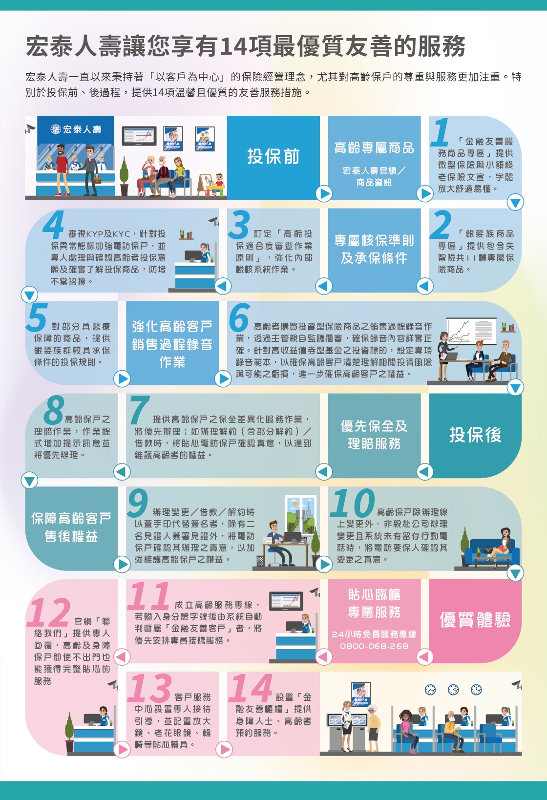 蔡副總以字體放大、專為高齡族群所出版的「宏泰銀髮族特刊」為例進一步說明。為了讓高齡族群可以快速理解14項專屬於長輩們的友善溫馨服務,宏泰人壽規劃圖文並茂的特刊,從投保前的保險資訊提供,投保過程中專屬核保準則及承保條件的設定,到投保後的售後服務及權益維護,以豐富的色彩及圖示將其化繁為簡,精心設計的排版配置讓長輩們能輕鬆理解必要的金融保險資訊,而這也是高齡族群避免被金融剝削的第一步。