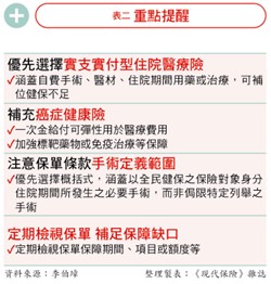 另外,全國各醫院申報被暫列或不列入給付的自費醫材品項,七年內也從六百五十種暴增到將近三千種,這也是健保一大缺口,因此李伯璋提出聰明選擇商業保險的四大方向,包括實支實付型住院醫療險、癌症健康險,注意保單手術定義範圍和定期檢視保單(詳表一) 。