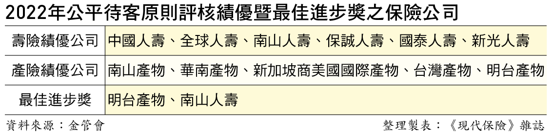 值得注意的是,在今(2022)年受到表揚的11家保險業者中,國泰人壽和中國人壽已連續四年都上榜,另外,金管會對於有顯著進步的保險公司也給予肯定,頒發了最佳進步獎,南山人壽及明台產險都獲得表揚。