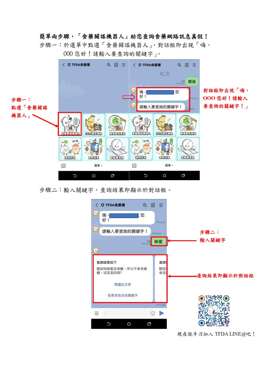 食藥署於104年4月24日成立「食藥闢謠專區」(https://www.fda.gov.tw/TC/news.aspx?cid=5049),蒐集各種通訊軟體、社群網路或網路論壇上有關食品、藥品、醫療器材及化粧品安全等傳言或迷思,並逐一破解,目前已發布超過500則闢謠文章。有鑑於消費者習慣以手機接收及搜尋資訊,食藥署將108年成立的「TFDA LINE@」連結「食藥闢謠專區」,於今(111)年8月開發「食藥闢謠機器人」功能,提供民眾另一種查詢謠言正解的便捷管道。只要加入「TFDA LINE@」好友,並在下方服務選單點選「食藥闢謠機器人」,輸入想要查證的關鍵字,簡單兩步驟,便可開始查詢相關資訊囉(操作步驟亦可參考附件)。