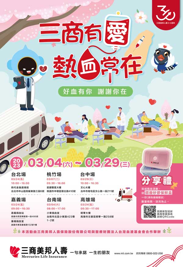 三商美邦人壽適逢邁向30週年,秉持「一句承諾 一生的朋友」的品牌精神,長期與台灣血液基金會合作舉辦捐血活動,每年於春、夏、秋、冬四季,在固定地點舉辦捐血活動,號召當地民眾加入捐血行列,希望民眾能養成定期捐血的習慣,用熱血緩解在地血庫存量不足的壓力;此外,三商美邦人壽的同仁亦會在活動現場服務捐血民眾,展現保險業的服務熱忱及三商美邦的熱血精神。
