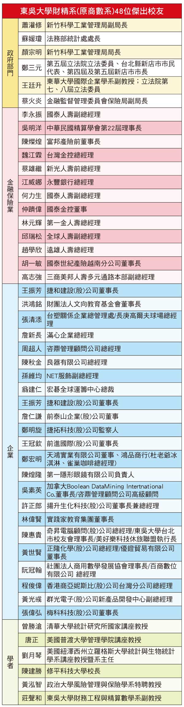 東吳財精系以商用數學的厚實底蘊,專注培育「商業決策分析」、「財務工程」與「保險精算」等專業人才。憑藉著優良校風、專業師資及系友的支持,累積無數傑出校友,備受產官學各界肯定。系友們傳承東吳大學「養天地正氣、法古今完人」的校訓,奉獻所學,以保險精算領域為例的傑出系友,包含金融監督管理委員會保險局蔡火炎副局長、中華民國精算學會吳明洋理事長、國立政治大學風險管理與保險學系黃泓智特聘教授、新光人壽蔡雄繼前總經理、第一金人壽林元輝總經理、富邦產險陳燦煌前董事長及國泰世紀產險胡一敏越南分公司董事長,以堅毅與熱情持續推動產業發展。此外,在各行業的傑出系友,包含12位於教育界及政府部門服務的官長、13位企業主與高階經理人及13位金融保險業資深經理人擔任本系傑出系友,皆成為學弟妹的榜樣,也為台灣高等教育奠定札實根基。東吳大學第一至三屆財精系(原商數系)48位傑出系友(詳右表)。
