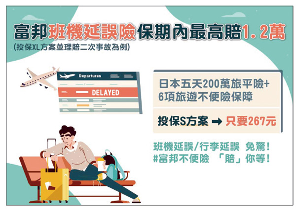 富邦產險表示,以投保保障最 完整的「海外旅平險+不便險-XL方案」為例,班機延誤超過4小時,保期內最高可給付1.2萬元(以理賠2次事故為例);當抵達國外目的地行李延誤達6小時後仍未取得,依保單約定可定額給付1萬元。而小資族也有「S方案」,旅遊平安險保額200萬元,日本五天的行程,保費只要267元。「XS方案」則是特別為15足歲以下兒童推出,保費最低不到百元。