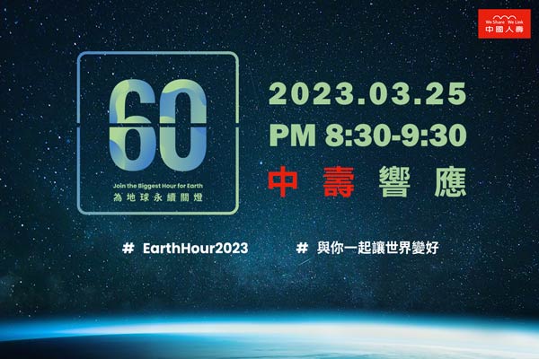 為促使社會大眾正視全球氣候變遷及極端氣候劇增議題,中國人壽與中華開發金控,共同響應由世界自然基金會(WWF)所發起的Earth Hour關燈一小時活動,於3月25日晚上八點半至九點半,關閉總公司及各分公司等非必要照明,以實際行動減碳愛地球,也發揮企業影響力呼籲在全球氣候變遷下,每個人無論年齡、性別及背景,都有改變世界的能力與責任,改變過度消耗地球資源的生活習慣,共同實踐低碳生活,守護我們與下一代的未來。