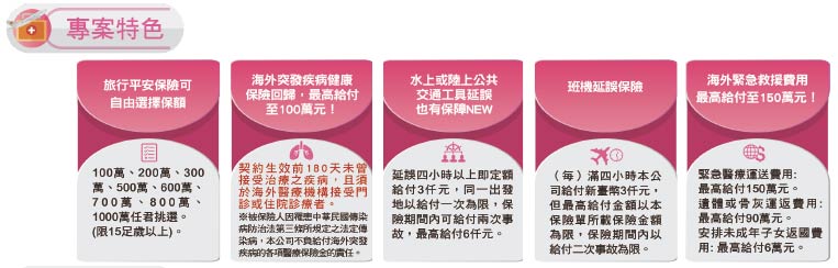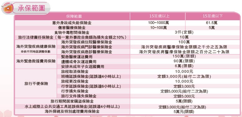 投保旅平險時是否擔心預算不夠或者保額不夠高呢?明台產物「出國の好險」專案,提供從低保額100萬方案到高保額的1,000萬方案,含不便險+海外突發疾病(傳染病除外)的完整保障方案5天保費從410元〜1,135元,符合各種族群的需求。但是仍要注意如為高齡族群(65歲以上)有投保年齡之保額限制,投保時務必要睜大眼睛哦!