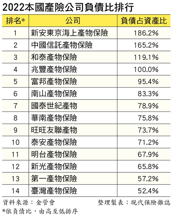 以2022年產險業平均負債占資產比83.7%來看,銷售防疫險的六大公司全都超過平均值,包括新安東京海上產險的負債占資產比高達186.2%,中國信託產險165.2%,超過100%的還有和泰產險119.1%、兆豐產險100.0%(四捨五入進位,實為99.95%)。