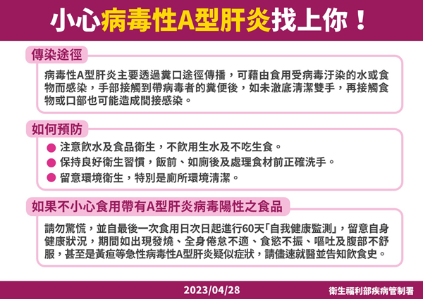 依據疾管署監測資料顯示,截至今(2023)年4月27日,急性病毒性A型肝炎累計32例確定病例,其中本土病例30例及境外移入2例,本土病例低於去(2022)年同期(86例)且與2019至2021年同期(25、20、27例)相當,近期並無病例增加情形。針對本事件,將請各縣市衛生單位及醫療院所提高警覺,對於疑似或確定A型肝炎個案詢問相關飲食史,並進行病毒序列比對,以釐清國內有無相關傳播發生。