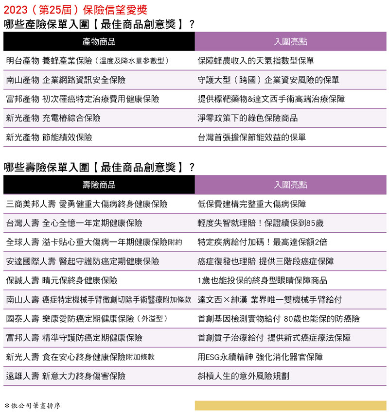 尤其醫療發展日新月異,傳統的醫療保險商品,已無法完全符合最新的保障需求,因此,碎片化、精準式的保險商品,如雨後春筍般興起,不少兼具創意和消費者效益的保單,也擠進【最佳商品創意獎】入圍榜單。