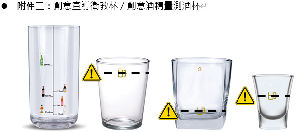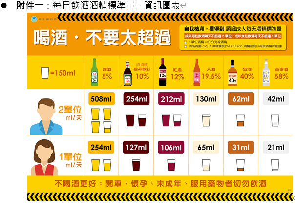 但怎樣才是「不超過」呢?方志友說平時建議朋友飲酒不過量,但卻又說不出什麼是適量的標準。陳亮妤司長指出,成年男性飲酒不超過2單位,女性不超過1單位,1單位等於10公克的純酒精。以啤酒而言,建議男性飲用不超過508毫升,女性不超過254毫升。含酒精的提神飲料,男性飲用不超過254毫升,女性不超過127毫升。飲用紅酒,則男性不超過212毫升,女性不超過106毫升。飲用米酒,男性不超過130毫升,女性不超過65毫升。飲用酒精度40%烈酒,男性不超過62毫升,女性不超過31毫升。飲用酒精度58%的高粱,男性不超過42毫升,女性不超過21毫升。民眾可參考創意衛教杯,掌握不同酒類標準量的刻度提醒。衛生福利部亦同時發表「每日飲酒酒精標準量資訊圖表」,民眾可至全國監理站(所),各大醫院精神科或是成癮防治科、縣市衛生局,以及衛生福利部網站參考。(詳見附件一)