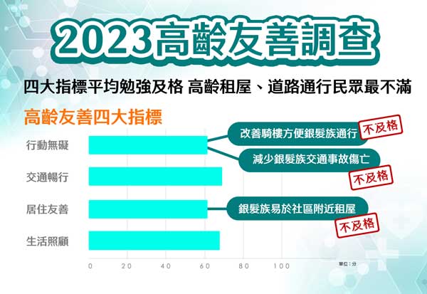 2026年台灣進入超高齡社會,銀髮族安居暢行卻大不易!中國信託金融控股公司旗下子公司台灣人壽保險股份有限公司(簡稱「台灣人壽」)攜手「網路溫度計」舉辦2023「高齡友善調查暨論壇」,首度公布「行動無礙」、「交通暢行」、「居住友善」、「生活照顧」四大高齡友善指標,全台22縣市平均分數守住六字頭勉強及格;其中「減少銀髮族交通傷亡」、「騎樓方便銀髮通行」和「銀髮族租屋」三項吞下不及格分,顯示行人地獄、高齡難安居仍是民眾最有感的痛。