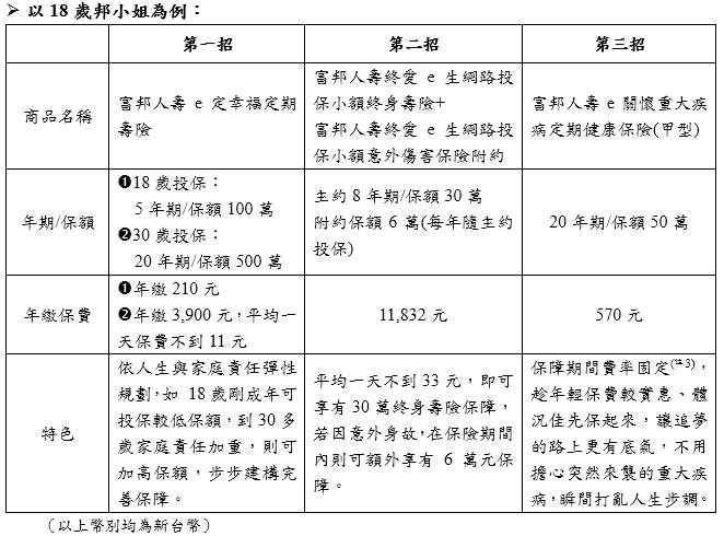 18歲年輕朋友經濟能力有限,又希望能擁有基本的終身壽險保障,建議可選擇小額終身壽險,不但享有身故、完全失能和祝壽保險金,還可自由選擇附加1年期小額意外傷害保險附約,增加因意外傷害事故所致死亡或失能的保障。由於小額終身壽險保費比一般同類終身壽險便宜,對於年輕世代的小資族來說更能輕鬆入手。
