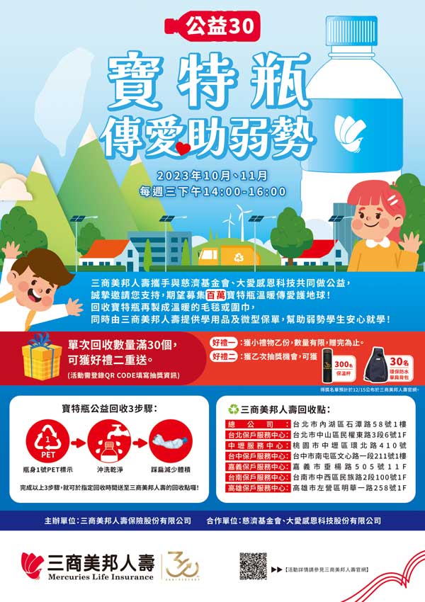 三商美邦人壽「公益30 寶特瓶傳愛助弱勢」活動將於今(112)年10月起於每周三下午進行,為期兩個月,除推動該公司內外勤員工積極參與外,也歡迎社會大眾發揮愛心,透過公益環保回收三步驟:先確認瓶身有1號PET寶特瓶標示、再將寶特瓶沖洗乾淨並壓扁,30個一袋就可拿至三商美邦人壽位於台北、中壢、台中、嘉義、台南及高雄等地的7個指定地點進行回收;為鼓勵民眾響應,每次回收30個寶特瓶,除了可獲得精美小禮物一份外(數量有限,贈完為止),還可掃QRcode抽環保背包及保溫杯,詳情請上三商美邦人壽官網查詢。