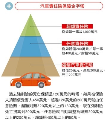 汽車責任險金字塔的各層保障雖各自運作卻搭配順暢,每一層的保障額度看似固定,但考量底層的強制險保額有可能調整,因此任意責任保險規定「本公司僅對於超過強制汽車責任保險給付標準以上之部分對被保險人負賠償之責。」超額責任保險則規定僅對於超過強制險與任意險的部份負責。