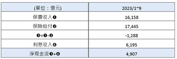 1. 壽險業保費收入及利息收入足夠支應保險給付需求,無入不敷出情事:欲窺知壽險公司現金流量概況,並非單看保費收入及保險給付,壽險業坐擁逾31兆投資資產,每年挹注可觀之利息、股利、租金及資本利得等投資收益,亦為支應保險給付之資金來源。2023年1~9月壽險業單利息收入即估計近6,200億,故綜合考量保費收入及利息收入後,現金流入遠大於保險給付,淨現金流入近5,000億元,無所謂入不敷出情事。