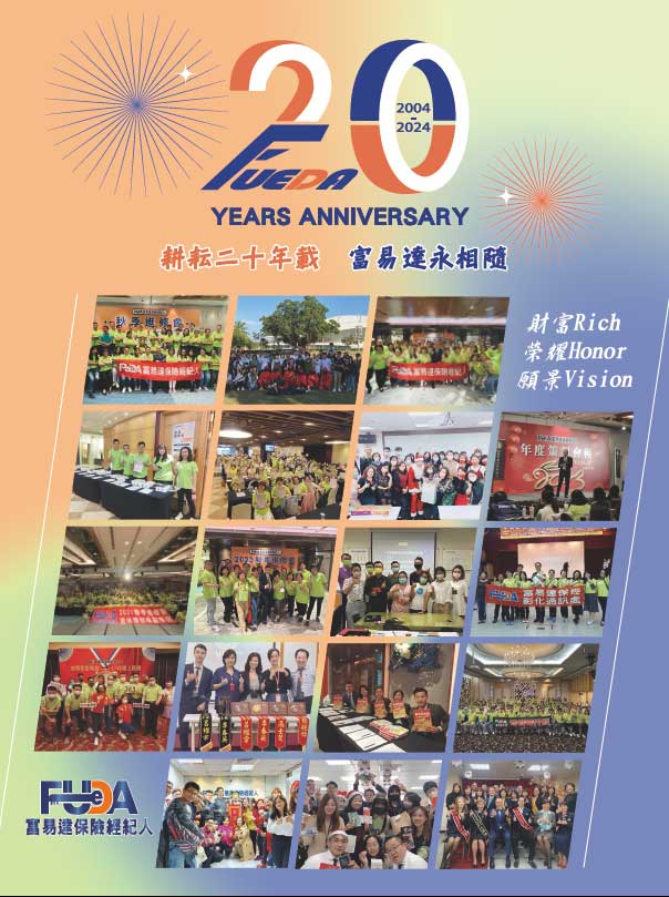 走過精采二十年,富易達將整合優質保經公司,擴大服務版圖,建立萬人保經團隊,照顧數萬個家庭,實踐永續經營的初衷,不僅再創下一個輝煌20,更朝向「百年保經企業」邁進,讓所有同仁以富易達為榮,一起攜手,卓越達成。■