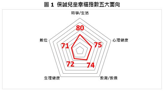 今年度「保誠兒童幸福指數」調查報告顯示,台灣兒童的幸福指數達75分(滿分為100)。在指數組成的各面向中,以「時事/生活教育」80分表現最突出,其餘為「心理健康」指數75分、「教育/教養相關」指數74分、「生理健康」指數則是72分,本次也特別挑出與數位、3C相關的內容,整合計算出「數位生活指數」,結果71分略低於其他面向,惟整體而言台灣孩子的幸福程度評別屬「幸福」。