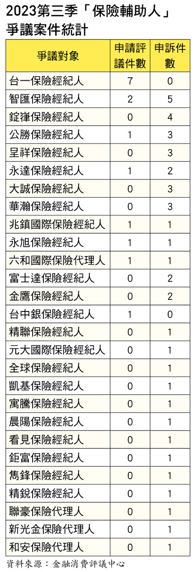 根據金融消費評議中心最新統計,今(2023)年第三季爭議最多的保險輔助人為台一保經和智匯保經,兩家公司的申請評議及申訴件數合計都高達7件,其次為錠嵂保經,光申訴件數就有4件。