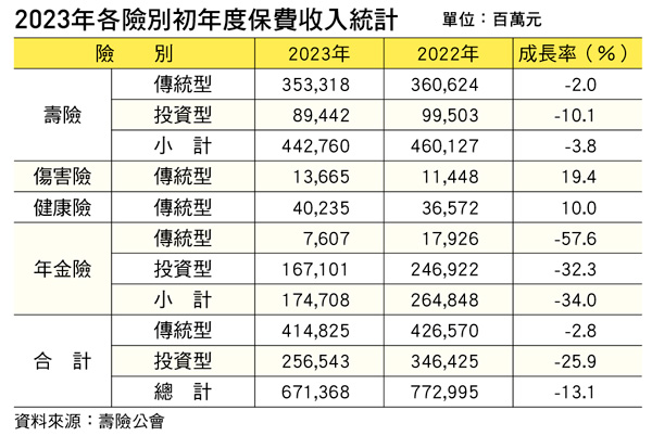 根據壽險公會統計,2023年度壽險FYP為6,713.68億元,較同期衰退13.1%;比較4大險種,僅傷害險、健康險呈現正成長,而傳統型保費合計4,148.25億元,衰退2.8%,投資型保費2,565.43億元,大幅衰退25.9%。
