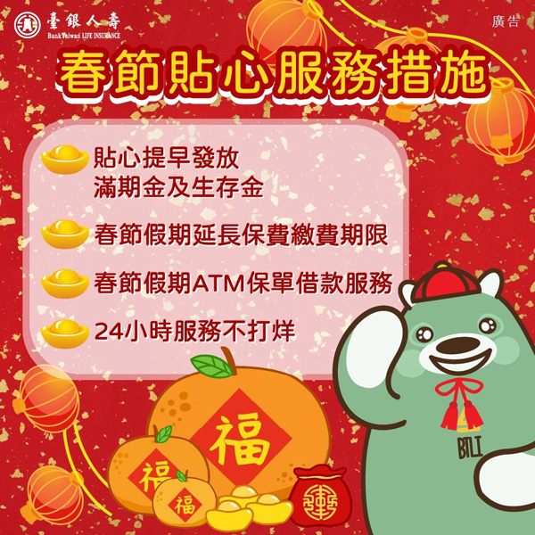 臺銀人壽於農曆春節特別規劃多項貼心服務措施。
