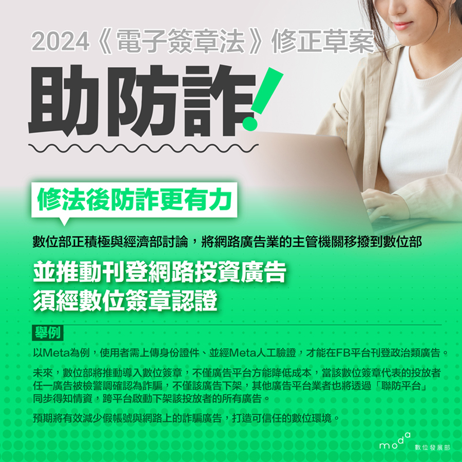 本次修法除了將促進數位經濟及智慧政府發展,數位部更積極與經濟部研議新增「無實體網路廣告」營業項目,並由數位部主管,未來將推動投資廣告刊登前先驗證數位簽章(電子簽章的一種),預期可有效減少投資詐騙與人頭廣告帳號,打造可信任的數位環境。