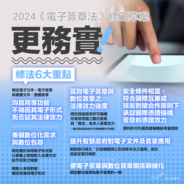 數位發展部表示,現行「電子簽章法」實施以來已逾20年未修正,為因應全球數位轉型趨勢、數位經濟與數位服務快速發展,本部提出「電子簽章法」修正草案,明定電子文件及電子簽章的功能等同實體文件及簽章,確認電子簽章的法律效力。草案經行政院會於2月29日通過,並函請立法院審議。