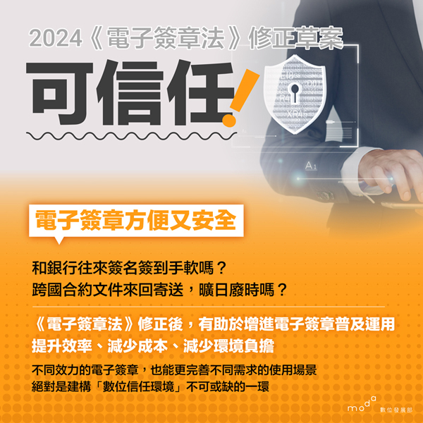 數位部致力於善用數位科技打造安全、可靠、可信任的數位環境,包括推出111政府專用短碼簡訊平臺、政府專用短網址,以及推廣零信任、行動自然人憑證(TW FidO)等先進技術,此次「電子簽章法」修法,正是打造數位信任的重要基礎。數位部將協助所轄數位經濟相關產業,攜手推動電子簽章普及應用,加速各行各業數位轉型。數位部也將積極與立法院溝通協調,期盼早日完成修法程序,以符合社會各界對本項法案的期待。