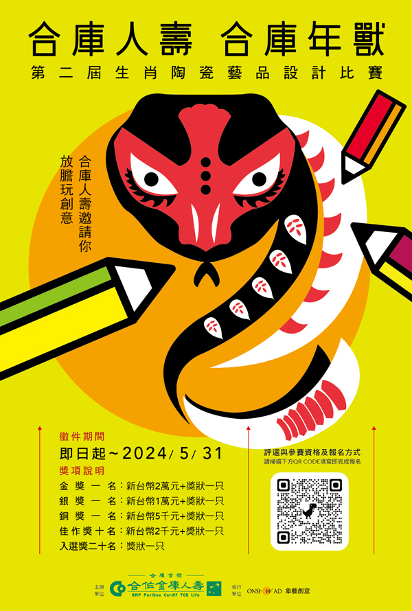合庫人壽延續多元創新精神,舉辦第二屆「合庫人壽,合庫年獸」生肖陶瓷藝品設計比賽,即日起至5月31日截止,邀請大專院校設計系學生踴躍參與,發揮創意。報名辦法請詳合庫人壽官方粉絲團。