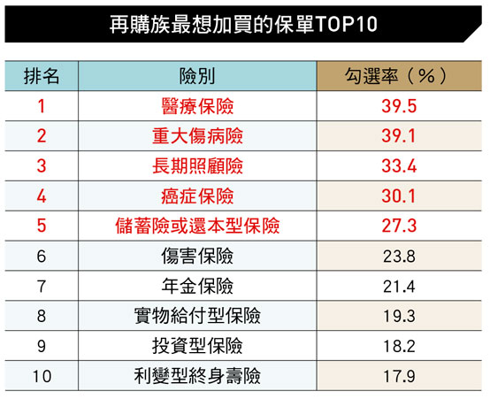 說到長照,普遍認為屆退族才是最想投保長照險的族群。但調查發現,再購族最想買的商品第3名「長照險」,再購意願最高的族群,年齡層下修到40~49歲的壯齡人口!