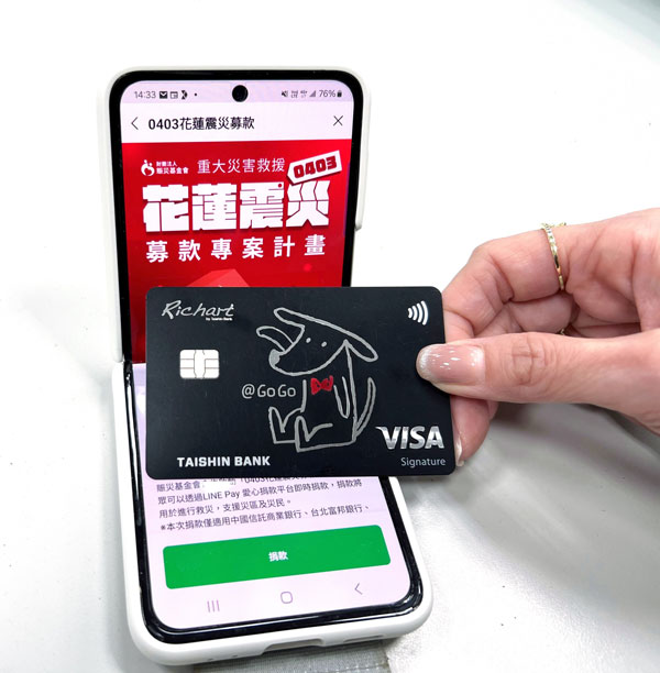 繼921後臺灣地區發生最大地震,於4月3日造成各地災情,花蓮受損尤其嚴重,為加速救災與重建,台新銀行呼籲卡友可透過LINE Pay愛心捐款平台,選擇「0403花蓮震災募款專案」,綁定台新銀行信用卡或簽帳金融卡立即捐款,捐款以新臺幣100元為單位,單次捐款金額上限為新臺幣10萬元。台新銀行為鼓勵百萬卡友共同響應,也特別提醒民眾若選擇以LINE Pay綁定@GoGo卡捐款,亦可同享最高3.8%回饋,盼能號召卡友一同施以援手、共體時艱,加速災民重建家園。