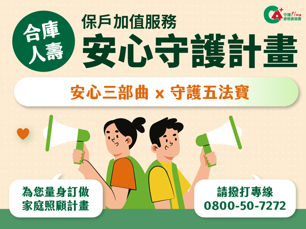 合庫人壽自2013年與家庭照顧者關懷總會合作推廣『照顧不離職』並提供各種支持性服務,包括「喘息咖啡」、「照顧電視台」、「喘息學院」等,今年特別針對保戶推出『安心守護計劃』,為保戶免費量身訂作長照計劃,包括「心理建設」、「資源盤點」、「服務連結」等「安心三部曲」,以及「守護五法寶」∶「照顧安排」、「彈性喘息」、「家庭會議」、「實務指導」與「安心交接」等一系列專業服務。藍年紳表示,家庭照顧最大的問題就是「人力」、「能力」與「財力」。透過『安心守護計劃』可以有系統的整合自身、企業及政府的資源,客製化照顧計劃,讓保戶以最有效率的方式聰明照顧、放手喘息。