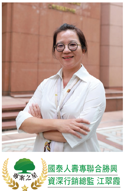 勇奪無數獎項及兩次MDRT-TOT殊榮的國泰人壽專聯合勝興資深行銷總監江翠霞,回首從業之路三十年,她認為保險是"人"的事業,「同理心」則是從業人員不可或缺的條件,因為接觸到不同職業領域及社會百態,從相互溝通、了解的過程中,將自己年輕時的火爆脾氣,慢慢地轉換為更加圓融柔軟,懂得感恩與珍惜,為家庭生活和樂帶來正向影響,也是她認為加入國泰最大的收穫。
