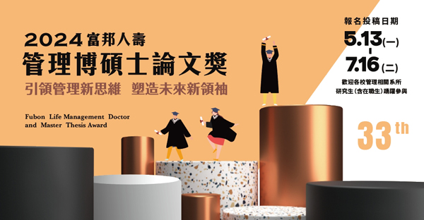 「富邦人壽管理博碩士論文獎」每年吸引全台近半數大專院校投入、逾千名師生共同參與競賽,評審委員更是集結學術界、產業界之優秀教授及成功企業家,經由嚴謹之審查程序,評選出優勝論文。「2024富邦人壽管理博碩士論文獎」徵稿時間自即日起至2024年7月16日下午6時止,歡迎管理相關研究所博、碩士畢業生(含在職生)踴躍報名參加。