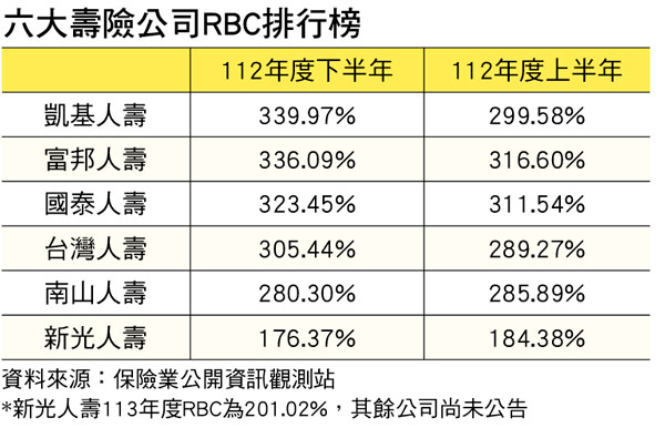 依主管機關規定,壽險公司每半年需公告資本適足性RBC,目前六大壽險112年度下半年RBC均已經公告。儘管新光人壽112年度下半年RBC未達法定最低標準,但8月初搶先同業公告113年度上半年RCB,已回升到201.02%,其他五家公司113年度上半年RBC則尚未公告。