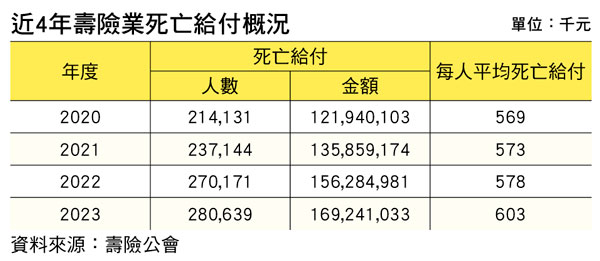 據統計,2023年壽險死亡給付保險金額為1,692.4億元,以給付人數28萬換算,等於每人平均死亡給付為60.3萬元,不論是給付總額或平均死亡給付皆創新高。死亡給付總額部分,1,692.4億元相較於2022年的1,562.8億元,增加8.3%;而平均每人死亡給付60.3萬元,則較2022年的57.8萬增加4.3%。