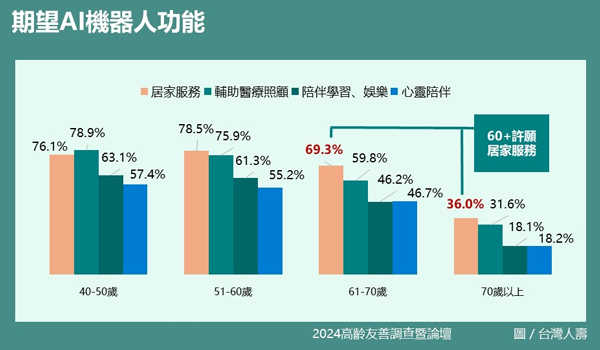 數位科技應用亦成為高齡者罩門,調查發現,70歲以上長者使用智慧手機普及率達五成以上(56.2%),但會運用APP或智慧系統者僅剩兩成(22.7%),科技應用力低落,成為AI進入高齡智慧生活的最大門檻。輝達(NVIDIA)執行長黃仁勳則看好未來AI生活潮流,預言機器人將成為老年家庭基本成員,承擔照顧長輩、陪伴聊天的角色,從調查中也顯示民眾對多功能的機器人也寄予厚望,近八成(78.9%)40至50歲民眾許願AI機器人具有「輔助醫療照顧」功能;51歲以上橘世代期望AI機器人成為「居家服務」好幫手,具備AI生活管家角色。
